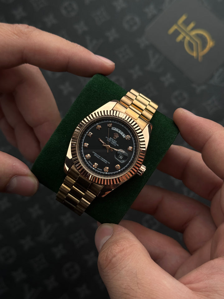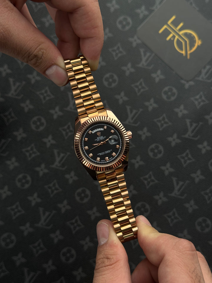 ️ ساعة روليكس روز جولد داي ديت قزاز أسود حزام برسيدنت